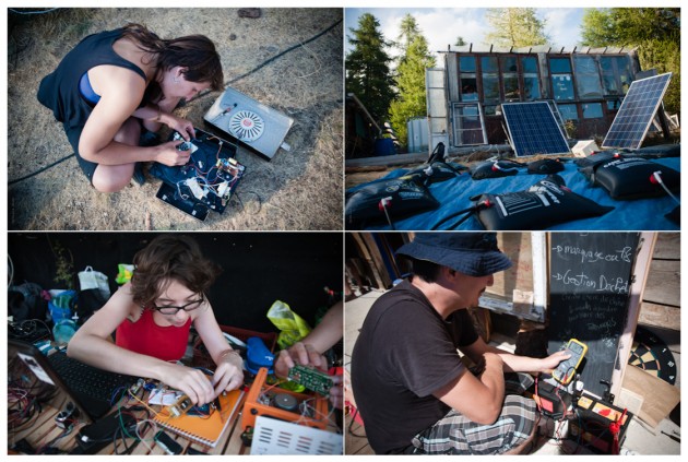 Mickael vérifie toutes les heures les installations, tourne les panneaux solaires, et répare les pièces qui ne manquent pas de claquer fréquemment depuis quelques jours. Pendant ce temps, les fers à souder s’échauffent et on bidouille des postes radio FM, pour écouter l’émission quotidienne de 18 heures, point d’orgue de chaque journée. Chacun peut participer, annoncer ou proposer des activités pour la soirée et le lendemain, raconter ses expérimentations en cours. En lieu et place des conférences programmées des Estives, les discussions sont lancés sur la radio du campement.