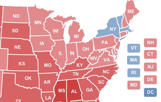Plus classique graphiquement mais plus insolite sur le fond, the Amazon Election Heat Map 2012 représente la couleur politique des États américains en fonction de la proportion de livres “bleus” (démocrates) ou “rouges” (républicains) achetés par ses habitants sur le site de vente en ligne du même nom. La couleur des livres est déterminée par l’équipe d’Amazon. L’équipe précise également que :
