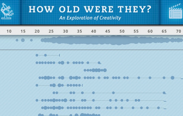 L’application “How old are they” [EN] est issue d’une réflexion étonnante : y a-t-il un âge privilégié pour la créativité ? Et si oui, est-il le même pour les romanciers, les musiciens ou les directeurs de films ? Si la liste des heureux élus peut sembler courte, l’idée est intéressante et la réalisation fluide et esthétique. Pas étonnant, periscopic.com est l’une des boîtes spécialisées dans la data (leur slogan : “faire le bien avec la donnée”, rien que ça) avec de beaux projets à leur actif comme Working in America ou Politilines.