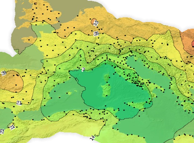Les scientifiques et historiens travaillant sur Orbis ont même fait des cartes isochrones de Rome : c’est-à -dire des cartes dont les frontières sont modifiées pour représenter le temps de trajet pour arriver en son coeur, ici Rome. Le but de ce travail de recherche : comprendre comment une ville a pu soumettre une grande partie de l’Europe, notamment par l’étude de leurs modes de communication.