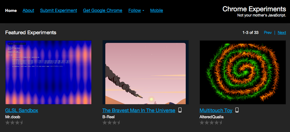 Outre la réalisation de projets comme le YouTube Symphony Orchestra, le laboratoire cherche à mettre en valeur toutes les possibilités offertes par JavaScript, et ceci en fédérant différentes initiatives : les désormais institués “Chrome Experiments” sont une série de projets artistiques sur le web, la plupart étant réalisés par les internautes eux-mêmes. Ces projets intronisent les “artistes de données” et veulent faire de Chrome le navigateur internet du partage et de la création artistique. Parmi les artistes de l’équipe l’on retrouve REAS, Mr Doob, Ryan Alexander, Josh Nimoy, Toxi et surtout, Aaron Koblin, directeur de la création, qui explique sur le blog Data Visions :