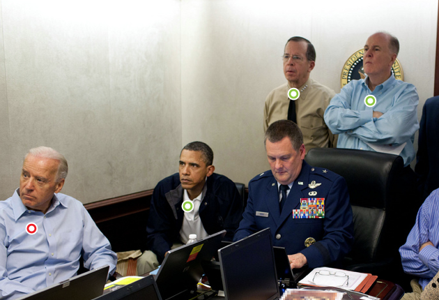 Quelques jours avant le raid fatal à Ben Laden, aucun consensus ne se dégage parmi les conseillers d'Obama. C'est ce que raconte le journaliste de CNN Peter Bergen, dans son ouvrage sur les dix ans de traque, dont Le Monde publie des extraits ce mercredi. Owni a plongé dans la fameuse Situation Room, illustrée des pensées des protagonistes.