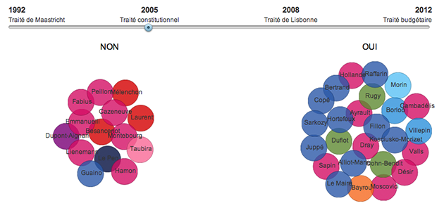 Note : “Le Monde a rassemblé les positions de 39 responsables sur quatre scrutins européens : deux sont des référendums (du 20 septembre 1992, sur le traité de Maastricht et du 29 mai 2005, sur le traité constitutionnel européen) ; deux sont des votes au Parlement.”