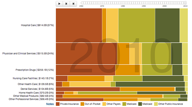Note : “In the past 50 years, the way health care is financed has changed, with private payers and public insurance paying for more care. This interactive graphic shows who paid for the nation’s health care and how much it cost.”