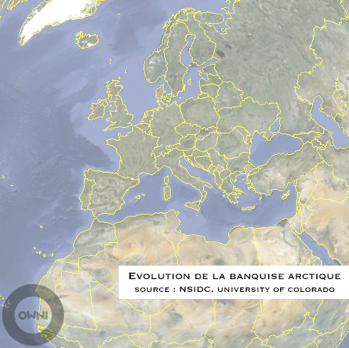 Rapportés à un carte, le constat n’est pas si évident : coincée entre le Nord de la Russie et le champs clairsemé des îles canadiennes, la régression est visible mais pas spectaculaire. A la manière de Skytruth, nous avons transposé la surface de ces étendues glacées aux contrées tempérées de notre luxuriante Europe. Les relevés géographiques mensuels des contours de la banquise de NSIDC, une fois projetés sur Google Earth, font apparaître l’effondrement (voir notre carte en .gif ci-dessous). Dans les années 1980, c’est toute l’Australie que l’on aurait pu cacher sous les glaces arctiques tandis que depuis 2007, seuls les Etats membres de l’Union européenne y trouveraient leur place…