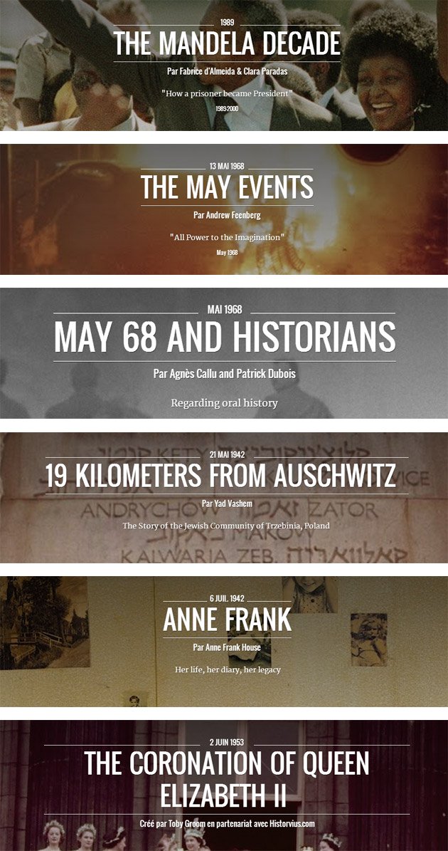 Le site propose donc 42 histoires de 1900 à 2000 à travers une frise chronologique simple et élégante. On y retrouve des sujets historiques comme la déportation pendant la Seconde Guerre Mondiale, Mai 68 ou des personnages comme Nelson Mandela, la Reine Elisabeth II ou encore Anne Frank.