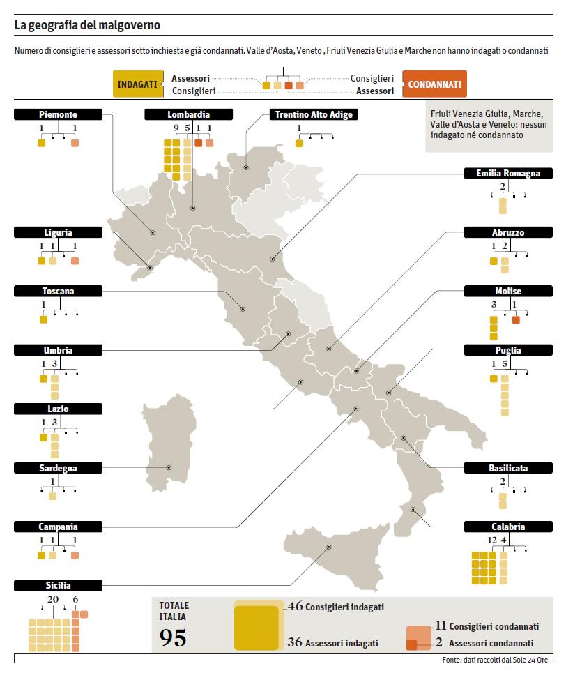 La majorité des affaires visant les personnels des régions portent sur la corruption et les délits associés (extorsion, détournement et abus de pouvoir), suivis du financement illégal. Les cas liant élus ou administrateurs à la mafia, la prostitution ou les attributions de marchés publics ou de permis de construire n’arrivent qu’en queue de peloton. Sur les vingt régions italiennes, seules quatre sont actuellement, d’après les information d’Il Sole, vierge de toute procédure judiciaire.