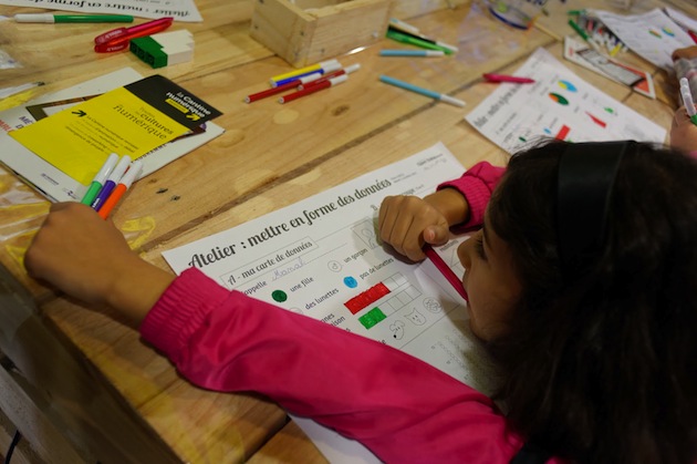 Notre mission : sensibiliser des écoliers à l’art de récolter les données et de les mettre en forme de différentes façons : diagramme circulaire, colonnes… Dans ma tête, ce n’est pas gagné d’avance. Comment intéresser des enfants à un concept aussi abstrait (et, accessoirement, paraître aussi cools que le stand d’à -côté, dédié aux imprimantes 3D et aux robots) ?
