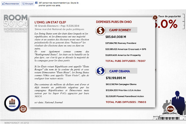 Superbe hybride, fruit du travail au long court de deux journalistes français, Moneyocracy propose une approche plus vivante mais pas moins informée sur les Super Pacs. Avec une dose de serious game et de vrais extraits des pubs les plus improbables diffusées à travers les États-Unis, Gérald Hubolowicz et Jean-Nicholas Guillot (fondateurs de l’agence Chewbahat) embarquent les lecteurs dans un voyage au pays où la télévision fait et défait les votes à coup de millions de dollars.