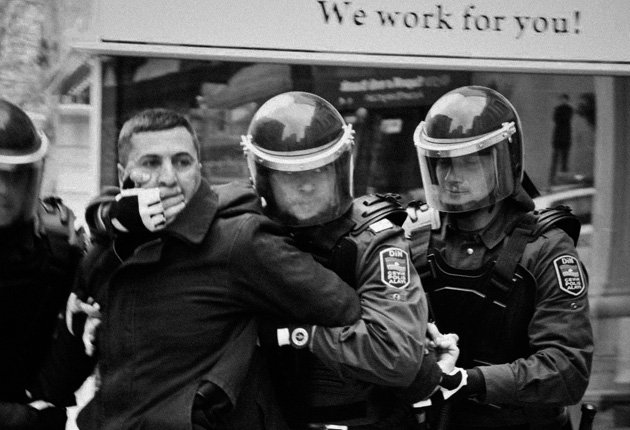 La police anti-emeute azerbaidjanaise détient un homme pendant une manifestation. Printemps 2012, Bakou. ©IRFS