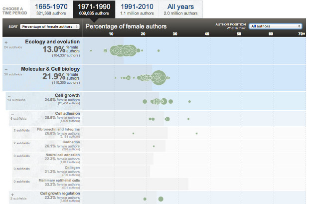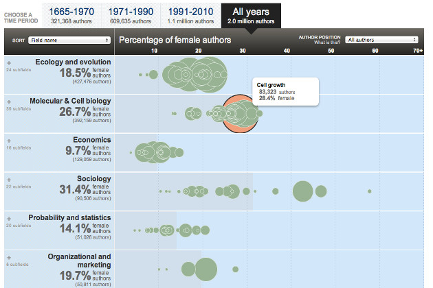 Poursuivant le travail mené par les chercheurs Jevin West et Jennifer Jacquet, spécialiste de l’étude des genres à l’université de Washington, le magazine universitaire The Chronicle a remis en forme les conclusions de leur première tentative de visualisation de la place des femmes dans les publications scientifiques (au départ visualisé avec la librairie Javascript Infovis, voir ci-dessus).