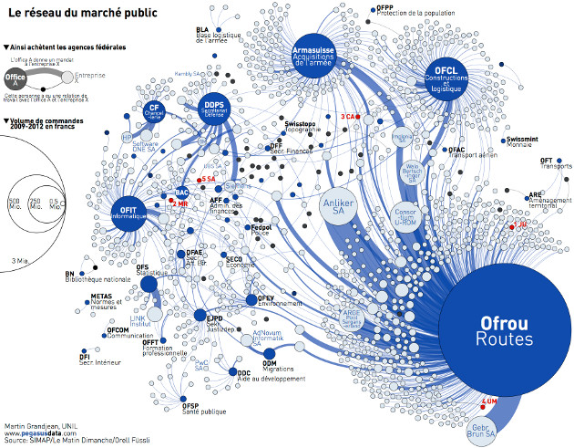 Le quotidien suisse Le Matin a traqué les liens entre public et privé dans l'attribution des marchés publics pour les résumer en une magnifique carte où se mêlent argent, influence et conflits d'intérêts, en s'appuyant sur le registre des appels d'offre de la confédération helvétique.